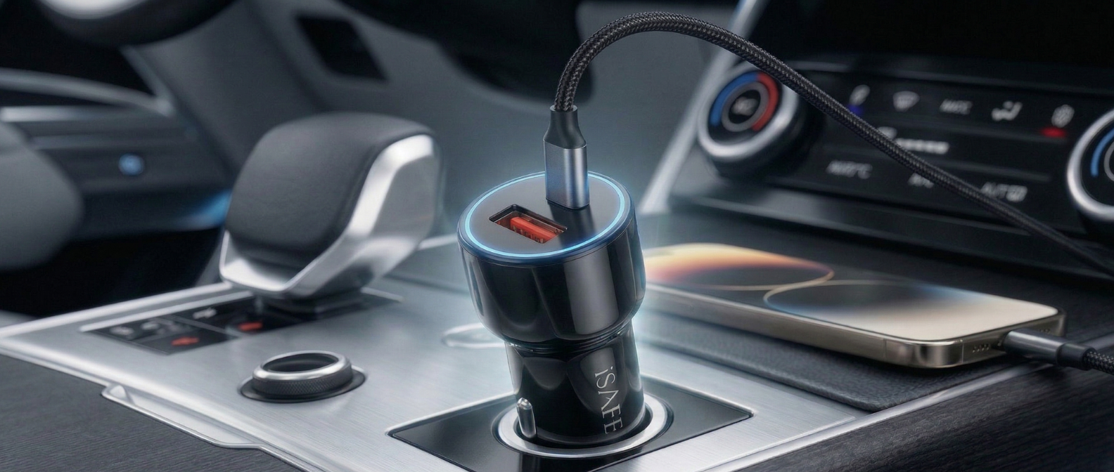 Built with a sleek and durable design, the iSAFE car charger fits perfectly into your car’s power socket. Its compact form factor ensures portability, while premium materials provide long-lasting performance and safety.